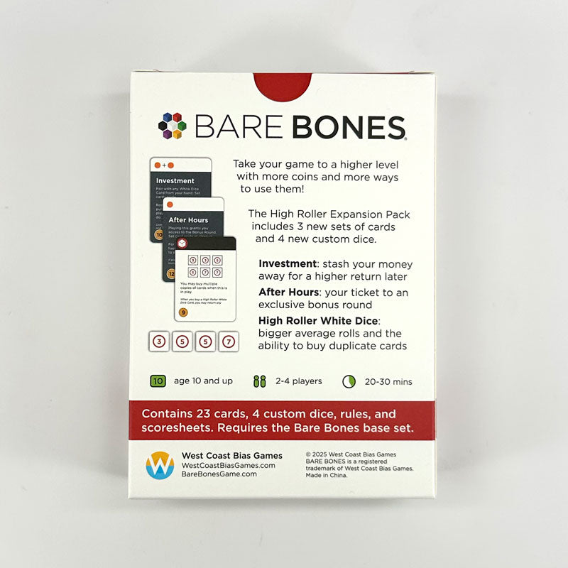 The High Roller Expansion Pack includes 3 new sets of cards and 4 new custom dice.